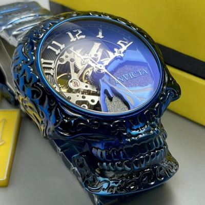 Pre-owned Artist Skull Automatic Skeletonized Blue Stainless Steel 50mm Watch