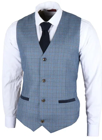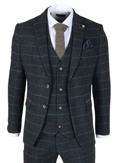 Archer 3 Piece Checked Herringbone Tweed Tailored Fit Formal Suit In Blue