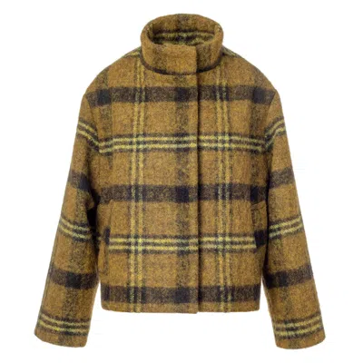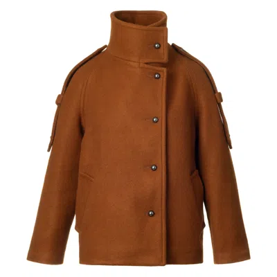 Women's Brown Short Wool Coat With High Collar And Shoulder Details