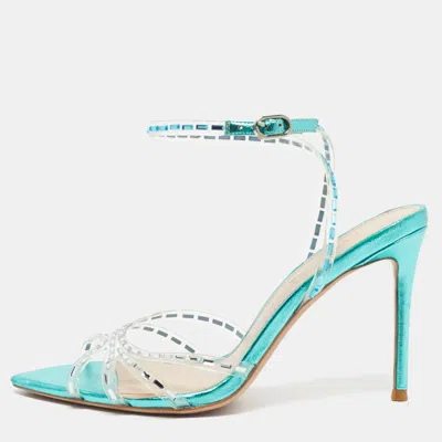 Transparent/metallic Blue Leather And Pvc Crystal Embellished Ankle Wrap Sandals In Multi