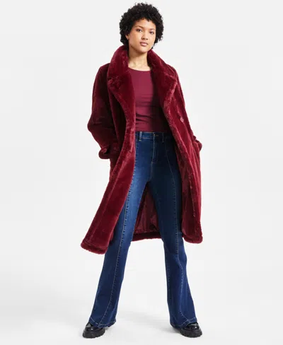 Juniors' Faux-fur Double-breasted Coat, Created For Macy's In Burgundy