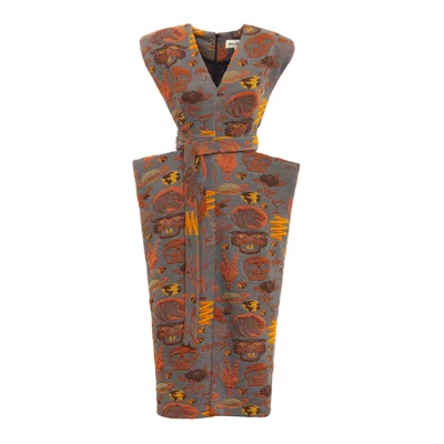Women's Grey / Yellow / Orange Fashion Midi Dress With Belt And Bold Shoulders Jacquard Grey In Pink/purple/grey