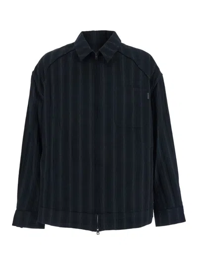 Blue Bowling Shirt With Cuban Collar And All-over Striped Motif