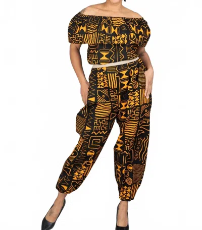 African Print Off-shoulder Jumpsuit In Black/yellow In Multi