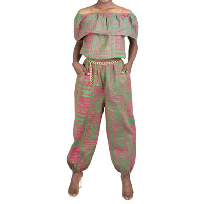 African Print Off-shoulder Jumpsuit In Green/pink In Multi