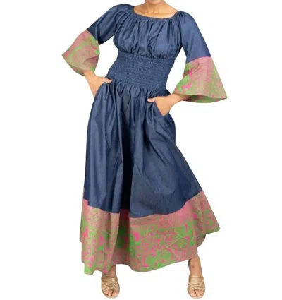 Off-shoulder Smocked Waist Dress In Denim Green In Blue