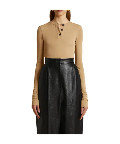 With industry experience as a design director at Vera Wang and Maiyet, Parsons graduate Catherine Holstein debuted her womenswear line Khaite for Fall/Winter 2015. A study in contrasts-- between masculine and feminine, severity and softness, fluidity and structure-- the label advances a refreshingly polished take on American sportswear staples. Elegantly pared-down shapes and a muted color palette highlight Holstein’s expertise in luxuriously textural fabrics. Inspired by tried-and-true vintage styles, the label’s stand-out Vanessa jean pairs a feminine high-rise with a modern straight-leg fit. Mid-length skirts and flared trousers are crafted in structural cotton twill, while long satin dresses, cotton poplin shirts, and crepe blouses are elevated by unexpected details. Mainstays such as soft cashmere knits, and sensuous jersey bodysuits round out Khaite’s collection of easy-to-wear basics.