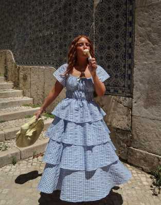 X Rebecca Olivia Gingham Tiered Midaxi Dress In Blue