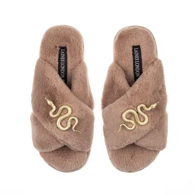 Women's Brown Classic Laines Slippers With Gold Metal Snake Brooches - Toffee