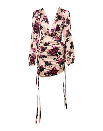 Pre-owned Floral Silk Long Sleeves V-neck Ruched Mini Women's Dress () In Pink