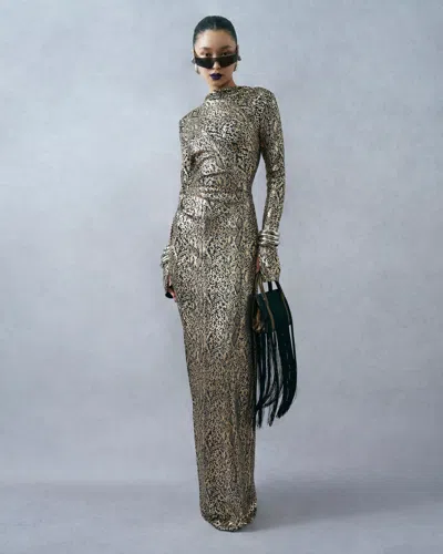 Metallic Snake Jersey Long Sleeve Ruched Gown In Gold