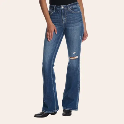 Women's Medium Wash Distressed High Rise Flare Jeans In Blue