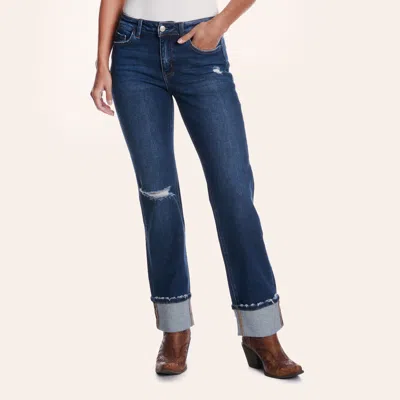 Women's Medium Wash Distressed Straight Leg Cuffed Jeans In Blue