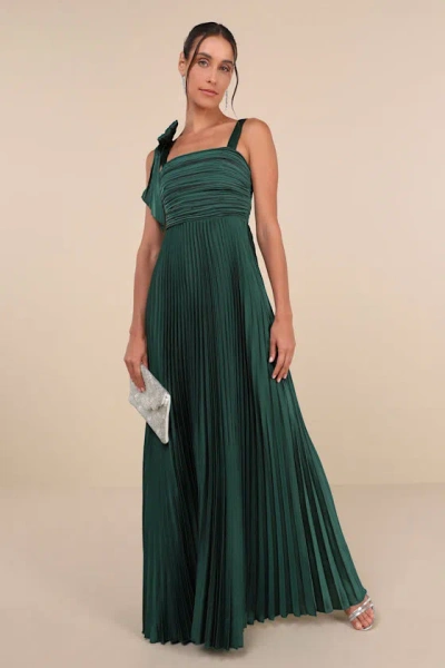 Gorgeous Purpose Emerald Satin Pleated Sleeveless Bow Maxi Dress In Green