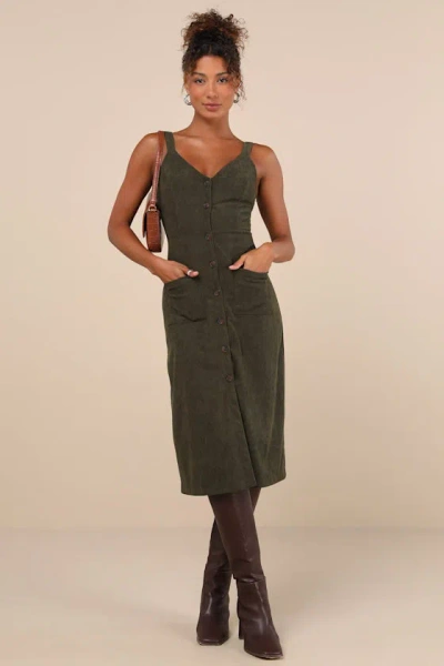 Certainly The Sweetest Olive Corduroy Button-front Midi Dress In Green