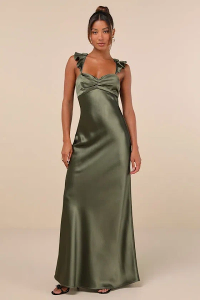 Exuberant Luxury Olive Green Satin Ruffled Lace-up Maxi Dress