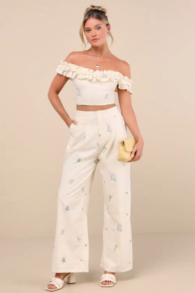 Rowena Cream Embroidered Wide-leg Pants In White