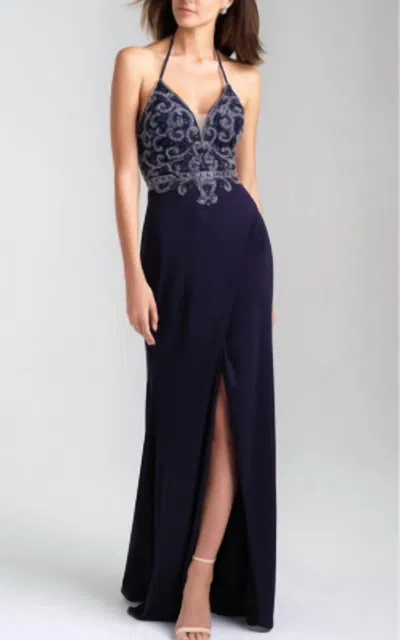 Beaded Halter Gown In Navy In Blue