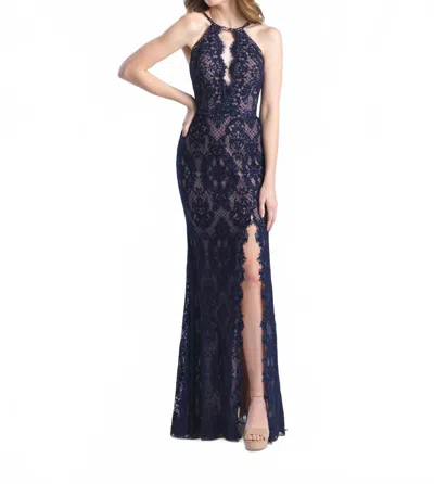 Lace Allover Slit Halter Prom Dress In Navy