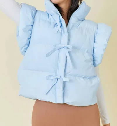 Ruffle Puffer Vest With Bow Tie Detail In Light Blue