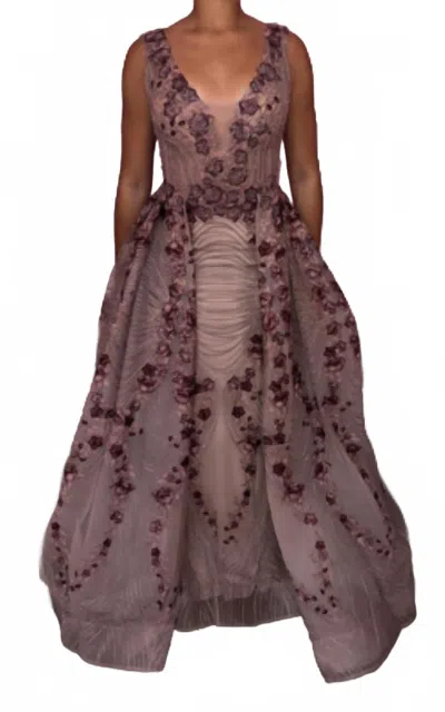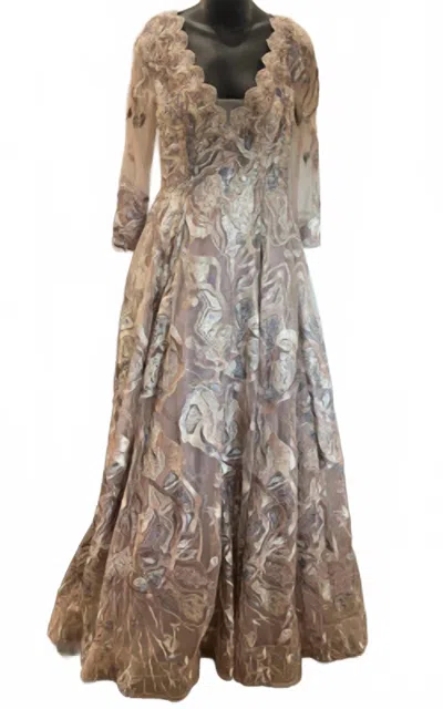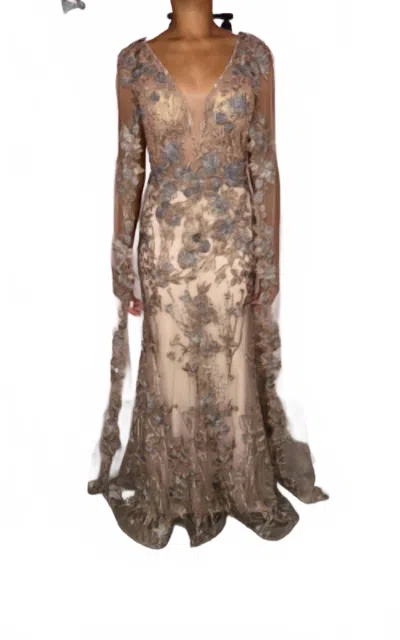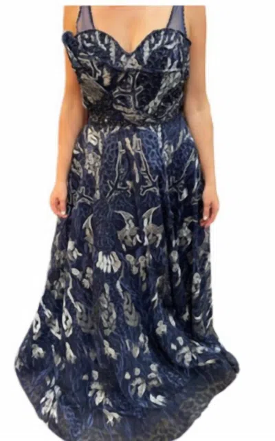 Beaded And Lace Applique Ballgown In Navy In Blue