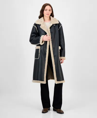 Juniors' Long Faux-shearling-trimmed Coat In Black