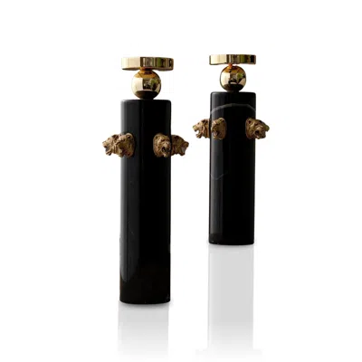 Black / White Set Of Two Carved Black Marble & Brass Candle Holders In Multi