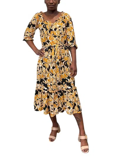 Ruffled Scroll Printed Dress In Black And Golden Yellow