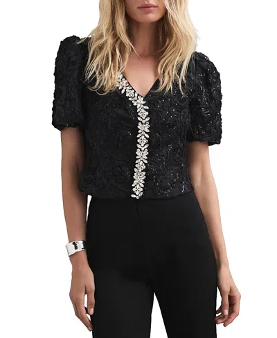 Embellished Puff Sleeve Sequin Top In Black