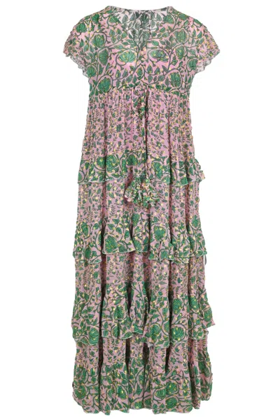 Pamela Long Dress In Pink | Floor Length Sleeveless V-neck Dress | Colourful Floral Print, Tiered Ru In Brown