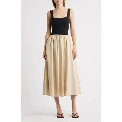 Stripe Bodice Mixed Media Midi Dress In Navy