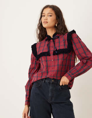 Plaid Print Scallop Collar Blouse In Brown