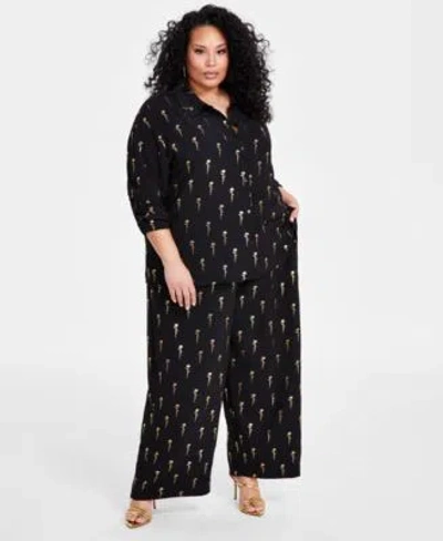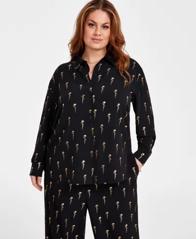 Plus Size Love-script Metallic-print Blouse In Black Gold Foil Rose Print