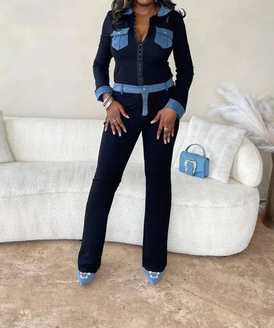 Yours Truly Denim Contrast Pant Set In Black/denim In Blue