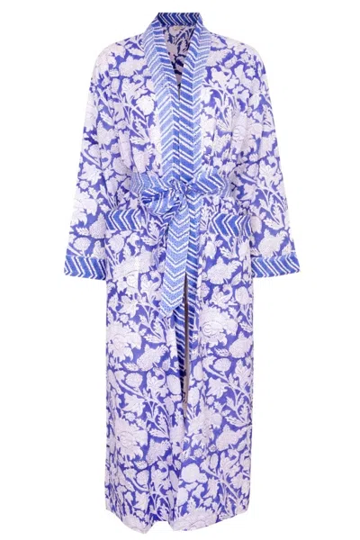 Women's Hand Printed Cotton Kimono Robe - Cornflower Blue