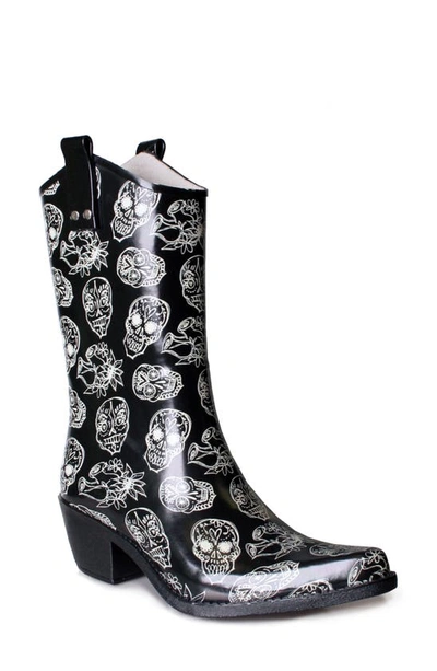 Yippy Cowboy Waterproof Rain Boot In Black/ White Skulls