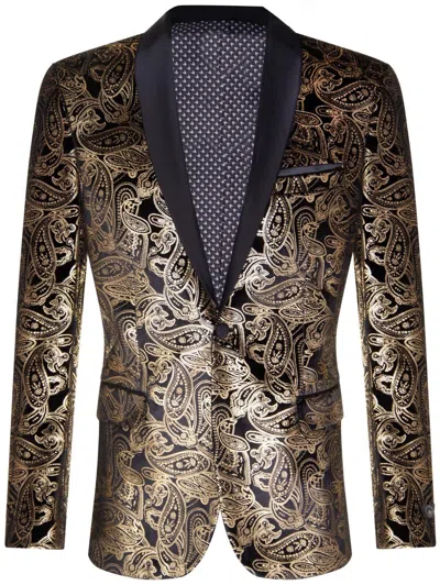 Mens Classic Gold Paisley Black Velvet Tuxedo Dinner Jacket Tailored Fit Blazer