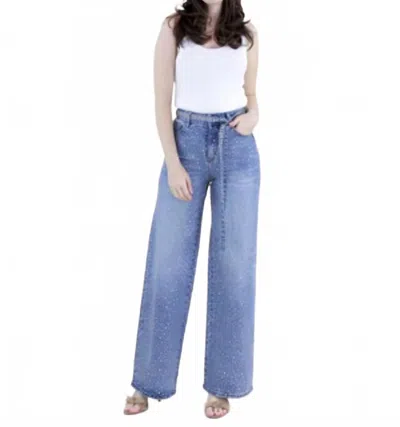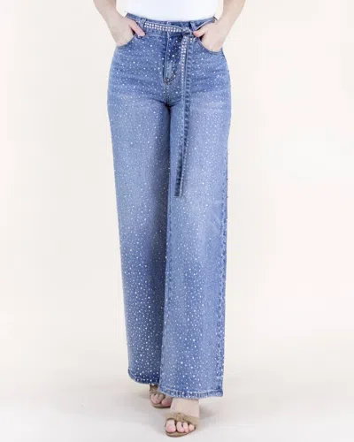 Droplet Rhinestone Embellished Belted High Rise Wide Leg Jeans Plus In Denim Blue
