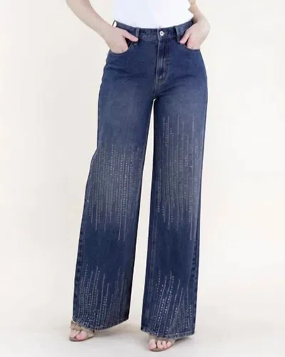 Square Rhinestone Lines Embellished High Rise Ultra Wide Leg Jeans In Denim Blue In Multi