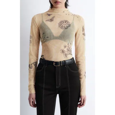 Mixed Print Funnel Neck Sheer Mesh Top In Neutral
