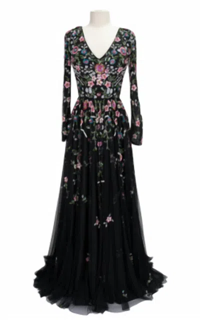 Women's Long Sleeve Floral A-line Gown In Black/multi In Burgundy