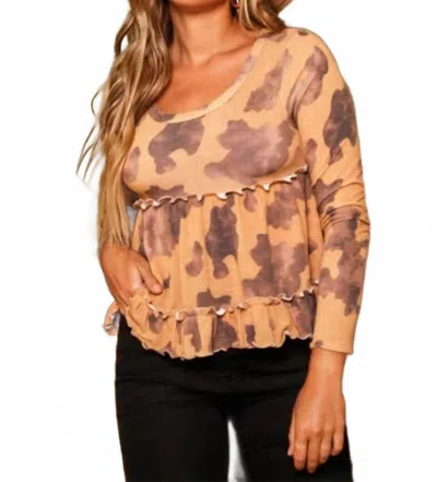 Cow Print Knit Ruffled Babydoll Top In Brown In Multi