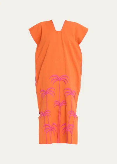 Single-panel Palm Tree Embroidered Midi Kaftan In Orange