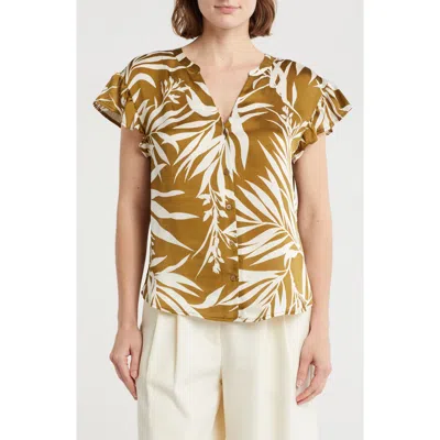 Short Sleeve Faux Wrap Textured Satin Top In Brown