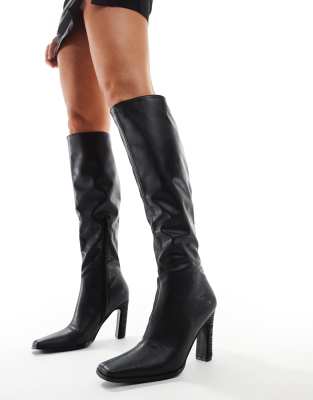 Acquilla Heeled Knee Boots With Square Toe In Black Pu