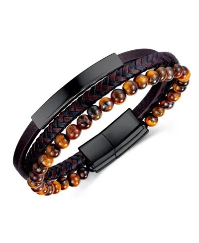 Black Tigers Eye Black Plated Leather Stainless Steel Bracelet In Multi
