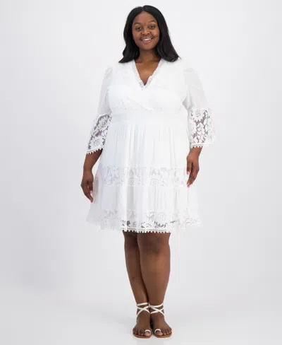 Plus Size Lace-combo 3/4-sleeve Dress In White