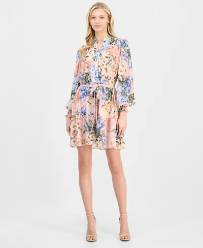 Petite Floral-print Chiffon Belted Dress In Pink