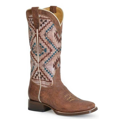 Pre-owned Women's Out West Southwestern Embroidered Western Boot Broad Square Toe - In Brown