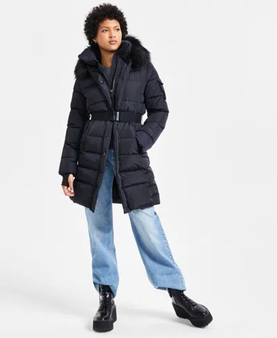 Women's Chalet Faux-fur-trim Hooded Belted Puffer Coat In Black,black